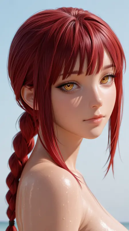시선을 위한 태그: 빨간 머리, 고리 모양의 눈, 땋은 토우, 노란 눈, 앞머리, 측면 머리카락