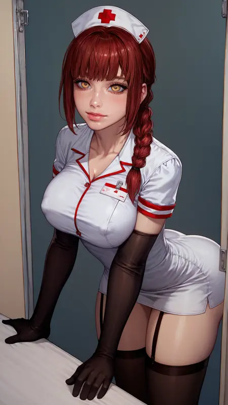 Tags for outfit: nurse cap with simple cross, short nurse dress, nurse, black elbow gloves,