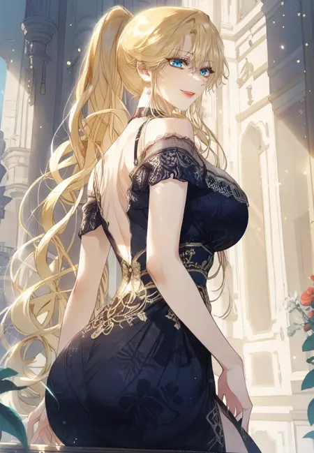 kayena hill, 1girl, blonde hair, long hair, blue eyes, bangs, eyelashes, hair between eyes, dress