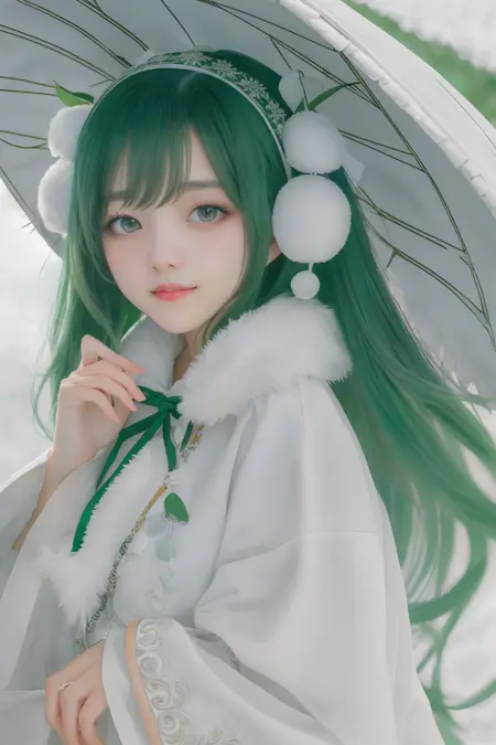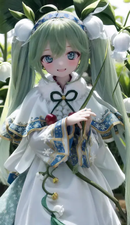 For clothes: capelet, fur-trimmed, boots, fur boots, knee boots, brown footwear, long sleeves, white dress, white capelet, hair ornament, hairband, snowflake print, snowflakes, blue hairband, white flower, hair flower, leaf, leaf hair ornament, lily of the valley, food, cherry, leaf umbrella