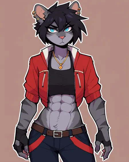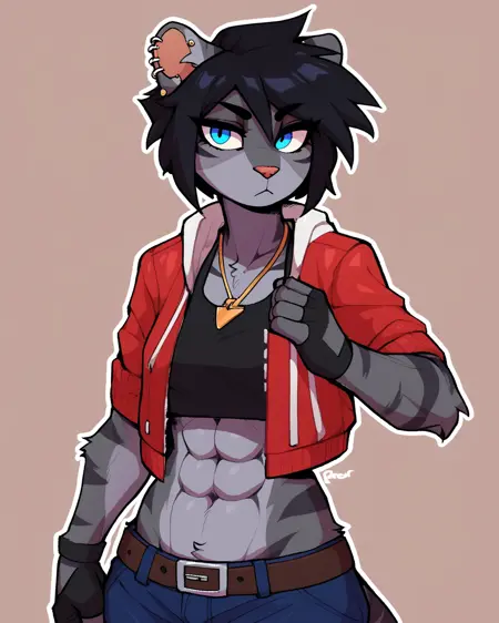 Triggers: short hair, furry female, blue eyes, female, furry, jacket, grey body, grey fur, fingerless gloves, necklace, pants, shoes, midriff, abs, black hair, topwear, open jacket, striped body, ear piercing