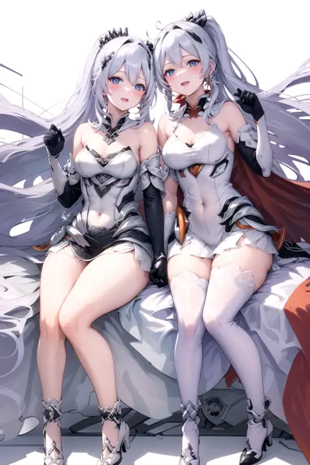 Fl4mescionFinality, 2girls, yuri, standing, smile, cowboy shot