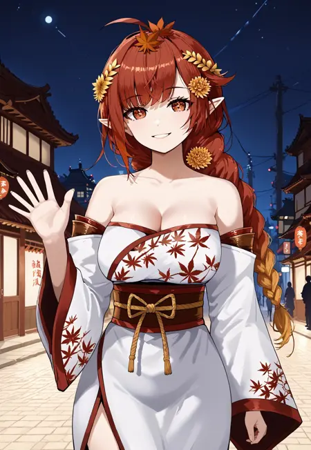 + BoBina1st, 어깨 드러냄, 일본 스타일 옷, 빨간 머리, 흰색 키모노, 긴 머리, 가슴, 땋은 머리, 넓은 소매, 흉터, 빨간 눈, 머리 장식, 큰 가슴, 뾰족한 귀, 분리형 소매, 띠, 오비, 긴 소매, 견갑골, 앞머리, 머리에 꽃, 단일 땋은 머리, 잎 무늬,