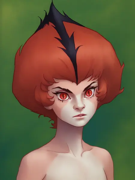w1lyk1t, black striped red hair, red eyes, slit pupils, w1lyk1t tunic, bare shoulder, w1lyk1t open toe footwear
