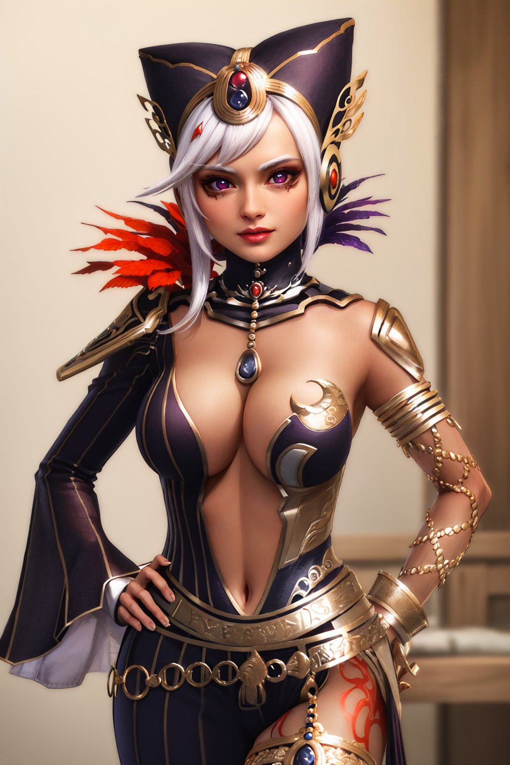 触发词 + 外貌: hwcia, 深色皮肤, 深色皮肤女性, 紫色眼睛