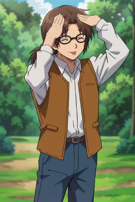 Kazu Notus (character) | brown hair, long hari, brown eyes, glasses, white shirt, brown vest, pants, ponytail | opaque glasses
