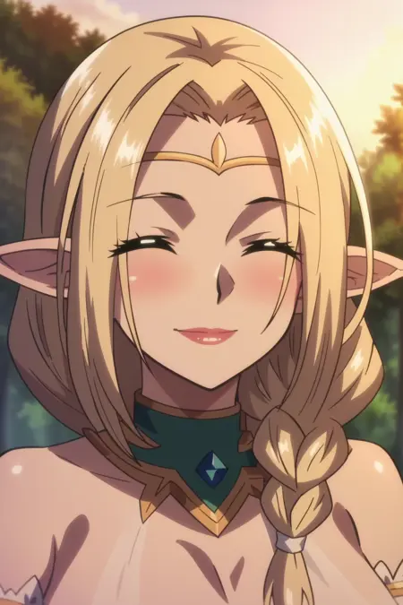 Mahnaria (character) | elf, pointy ears, green eyes, hair, braid, thighhighs, large breasts, see through | lipstick, eyes closed