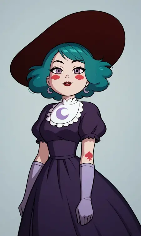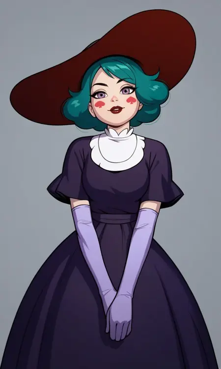| 训练词汇 | 1woman, pale skin, curly teal hair, bob cut, mauve purple eyes, hibiscus red spade-shaped marks on cheeks, gothic purple long dress,black sun hat with gray and white feathers, white cravat with purple crescent moon, elbow purple gloves, dark red lips已复制! |
