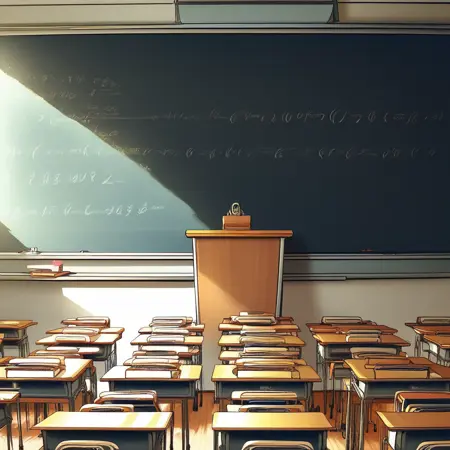 Optional: chalkboard, indoors, classroom, podium, desks, bookcase, globe