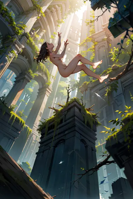 推奨ポジティブプロンプト:falling,(from below:1.2),falling_blur,depth of field,floating,focused、