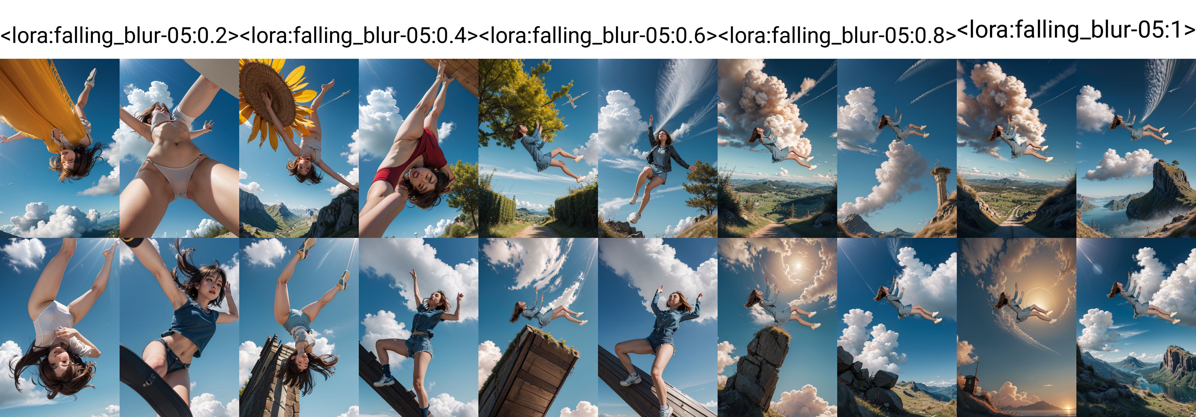 0.5可能多余肢体,但更灵活,换衣服,换姿势。0.50.6基本姿势固定,想要完全符合的肢体就调大权重,背景会更丰富。建议正向提示词:falling,(from below:1.2),falling_blur,depth of field,floating,focused, 其他想写什么就写什么。可以多试试。
