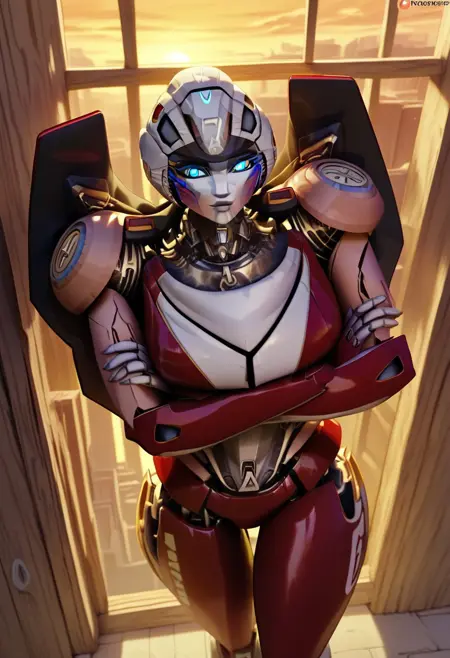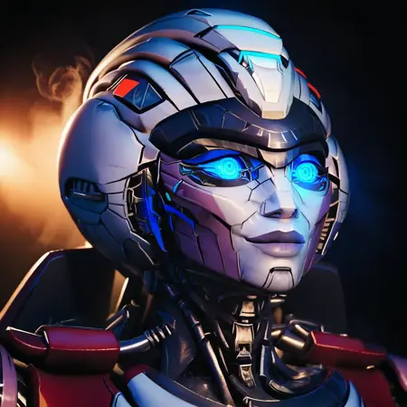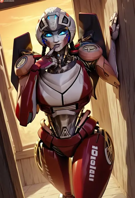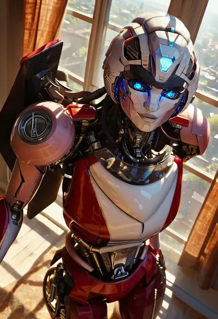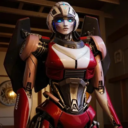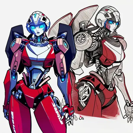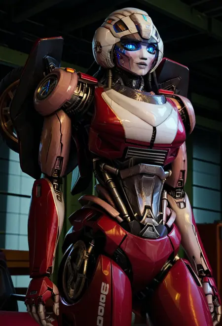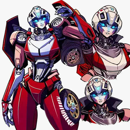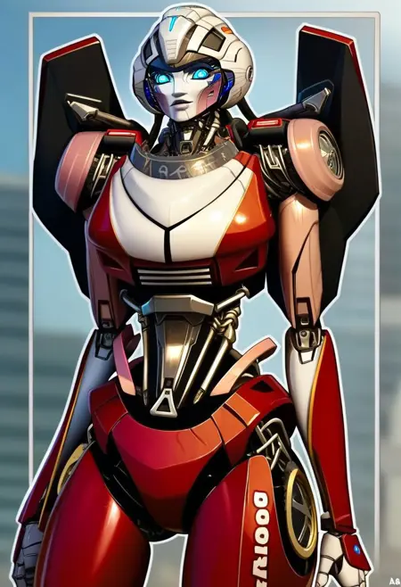 - arceerotb, autobot, 1girl, red and white body, mechanical parts, robot, helmet-like head, robotic face, glowing blue eyes, autobot symbol on forehead, fairing-like chest, wheels on back, 'ducati' printed on right leg, narrow waist