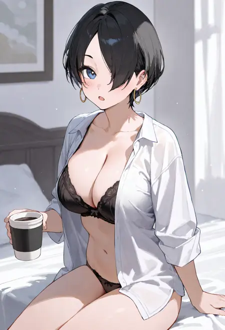 okitsuyuka, hair over one eye, black hair, short hair, blue eyes, earrings, breasts,
