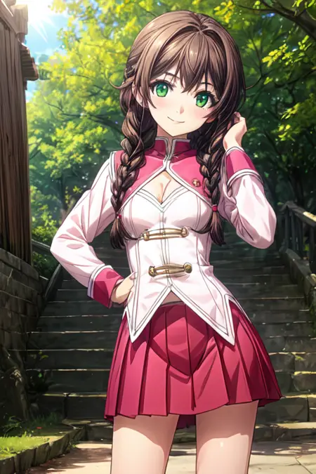 触发词:plsuc,军装,粉色水手领,白色上衣,长袖,粉色袖口,露胸切口,粉色迷你裙,百褶裙,粉色靴子