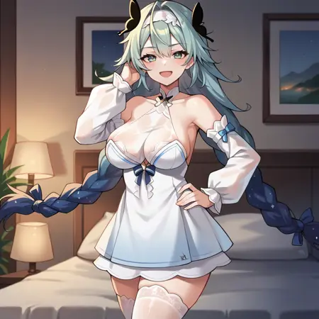 Brh_Drs, twin braids, aqua hair, gradient hair, starry sky hair, multicolored hair, covered breasts, hair ribbon, strapless dress, butterfly hair ornament, alt halterneck, alt short dress, alt white dress, frills, frilled dress, white thighhighs, see-through, detached sleeves, puffy long sleeves, frilled sleeves,