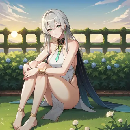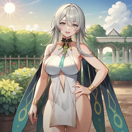 BrahmaAG, Brh_Alt, grey hair, long hair, halter dress, white halter dress, aqua necktie, armored collar, armlet, stole, eye mask, gold mask, covered eyes, headgear, wristlet, short pelvic curtain, cutout above navel, clothing cutout, sideboob, no eyes, barefoot sandals (jewelry),