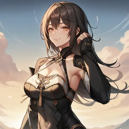 Iz_Def, 레오타드, 검은 레오타드, 하이터넥, 가슴 노출, 검은 목걸이, 어깨 덮음, 옷 절개, 긴 소매, 검은 소매, 손가락 없는 장갑, 검은 장갑, 분리된 소매, 다리 문신, 배꼽 덮음, 장신구, 금장식,