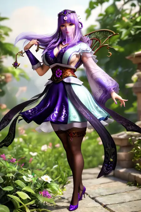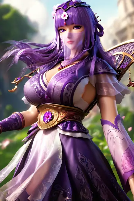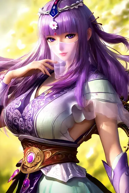 shao si ming, veil, mouth veil, see-through veil, purple hair, long hair, hair ornament, flower ornament, purple eyes, asymmetrical sleeves, dress
