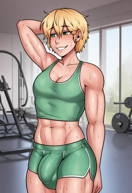 1girl, 가슴, 파란 눈, 싱글, 금발, 단발, 가슴 틈, 큰 가슴, 땀, 스포츠 브라, 얼굴 빨개짐, 입술, 미소, 근육질, 근육질 여성, 팔 뒤로 머리에, 눈 사이 머리, 겨드랑이, 팔 위로 들어 올림