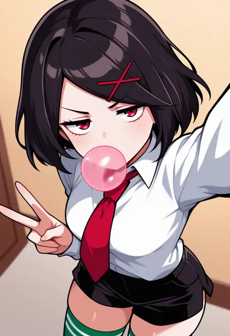 기본 복장: 흰색 셔츠, 빨간 넥타이, 긴 소매, 검은 반바지, 녹색 허벅지 스타킹