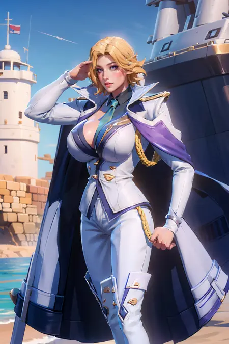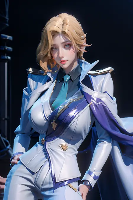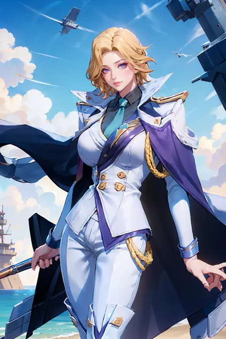 プロンプト: Taara_Soldier's_Fortune, 1girl, solo, short hair, blonde hair, looking at viewer, purple eyes, mole under eye, nose, lips, parted lips, necktie, blue necktie, collared shirt, breasts, large breasts, shirt, jacket, white jacket, cape, pants, white pants, thighhighs, boots, thigh boots, high heels, high heel boots, white footwear, jewelry