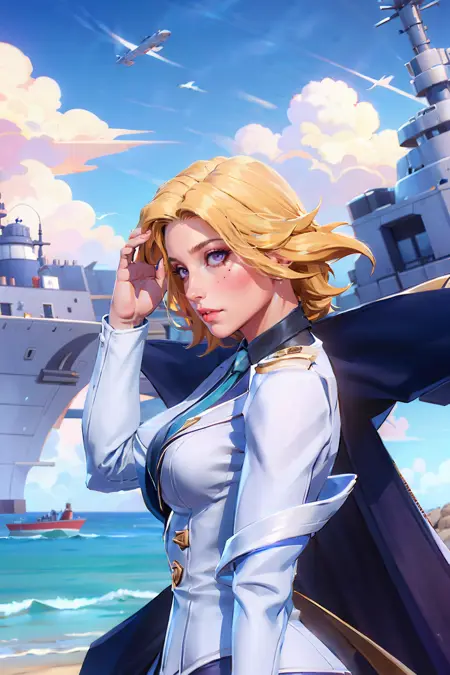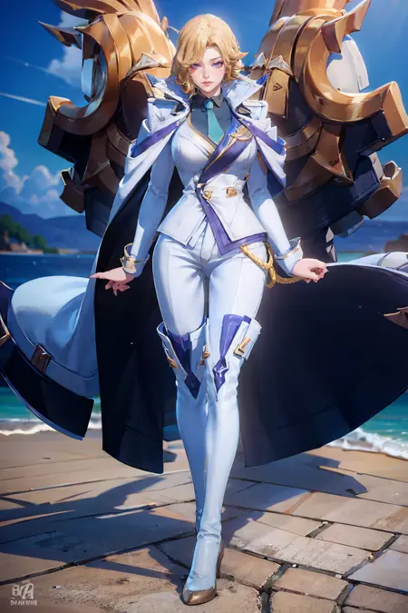 프롬프트: Taara_Soldier's_Fortune, 1girl, solo, short hair, blonde hair, looking at viewer, purple eyes, mole under eye, nose, lips, parted lips, necktie, blue necktie, collared shirt, breasts, large breasts, shirt, jacket, white jacket, cape, pants, white pants, thighhighs, boots, thigh boots, high heels, high heel boots, white footwear, jewelry