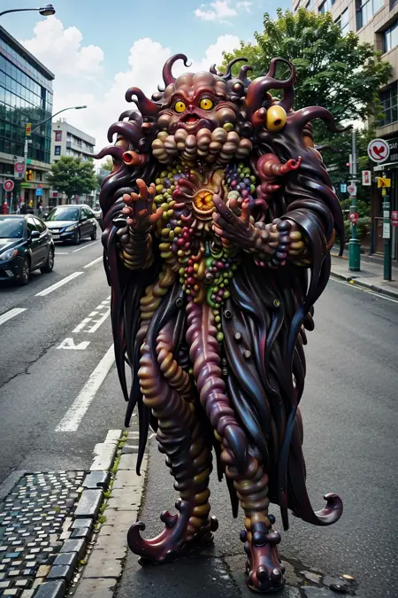 これは怪人風のLoRaモデルで、様々な特撮風のキャラクターを生成することができます。簡単に使うには、「1kaijin」を使うだけです。LoRaのトレーニング素材は完全に2D手描き(非常に平坦なもの)なので、「realistic」と「photorealistic」を追加して3D感を増やすようにしてください。また、これにより、「Hi.Res」を必ず使用する必要があります。このLoRaは、一部の2Dモデルでもうまく機能する可能性があると思いますが、試していないので、あなたに任せます。