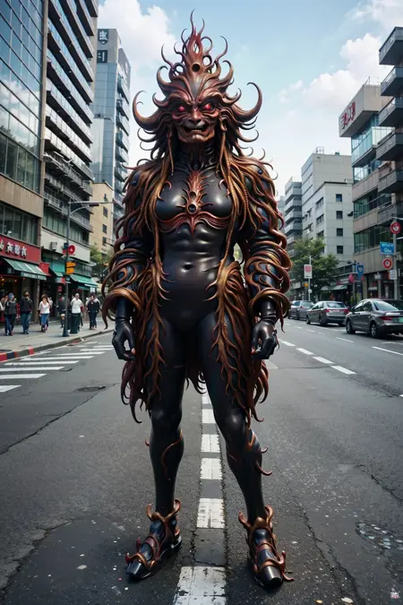 これは怪人風のLoRaモデルで、様々な特撮風のキャラクターを生成することができます。簡単に使うには、「1kaijin」を使うだけです。LoRaのトレーニング素材は完全に2D手描き(非常に平坦なもの)なので、「realistic」と「photorealistic」を追加して3D感を増やすようにしてください。また、これにより、「Hi.Res」を必ず使用する必要があります。このLoRaは、一部の2Dモデルでもうまく機能する可能性があると思いますが、試していないので、あなたに任せます。