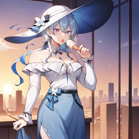 Sk_Cas、ローポニーテール、ロングスカート、サイドスリット、薄い青いスカート、青いリボン、外側のカラー、胸の間、乳首のライン、白いリボン、オフショルダーシャツ、フリルシャツ、白いシャツ、ロングスリーブ、帽子の花、フリルスリーブ、白いスリーブ、黒いベルト、代用白い頭部装飾、帽子、