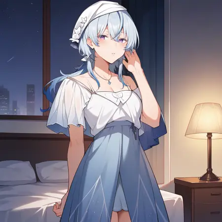Sk_Paj、ローポニーテール、白い頭部装飾、ネックレス、ドレスの下の白いカミソール、青いドレス、ショートドレス、手首のスクンチー、ミディアムスリーブ、青いスリーブ、ワイドスリーブ、レイヤードスカート、