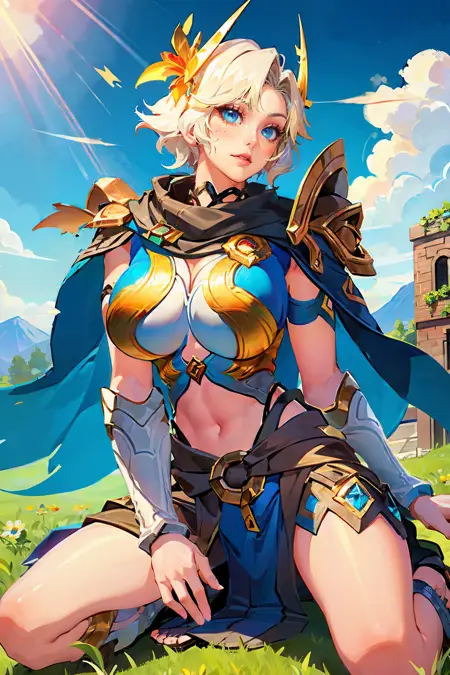 Prompt: Taara_Utopian, 1girl, solo, short hair, blonde hair, white hair, hair ornament, flower, hair flower, looking at viewer, blue eyes, eyelashes, mole, mole under eye, lips, parted lips, shoulder armor, pauldrons, breasts, large breasts, armor, cape, blue cape, navel, tattoo, legs, boots, sandals, toes, toeless footwear