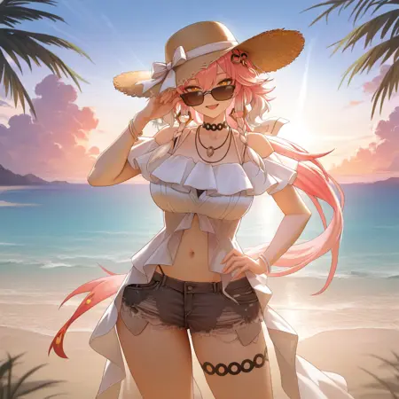 ChangliWuwa、Chg_Smr、黄色い目、低いポニーテール、ピンクの髪、白い髪、マルチカラーの髪、オフショルダーシャツ、白いシャツ、フリル付きシャツ、ブラストラップ、黒いチョーカー、太ももストラップ、デニムショートパンツ、カットオフ、パンティストラップ、ロングスカート、オープンスカート、フリル付きスカート、白いスカート、おへそ、中央開口部、腹部、わら帽子、サンハット、帽子のリボン、白いリボン、ネックレス、複数のネックレス、フリル付き袖、ブレスレット、クロスストリング、眼鏡除去、サングラス、ヘアオーナメント、