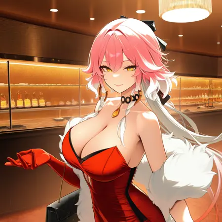 ChangliWuwa, Chg_Kfc, 노란 눈, 낮은 토끼 꼬리, 분홍 머리, 하얀 머리, 다색 머리, 어깨 노출 드레스, 빨간 드레스, 가슴 노출, 펜던트 초크, 검은 리본, 머리 리본, 검은 팬티스타킹, 긴 드레스, 사이드 슬릿, 모피 보아, 한쪽 팔꿈치 장갑, 빨간 장갑, 프릴, 검은 트림,