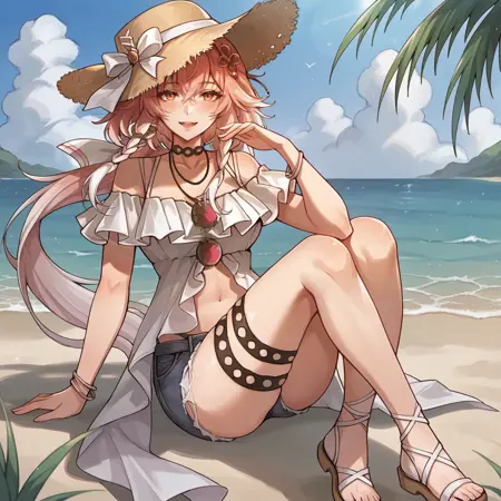 ChangliWuwa, Chg_Smr, yellow eyes, low ponytail, pink hair, white hair, multicolored hair, off-shoulder shirt, white shirt, frilled shirt, bra strap, black choker, thigh strap, denim shorts, cutoffs, panty straps, long skirt, open skirt, frilled skirt, white skirt, navel, center opening, midriff, straw hat, sun hat, hat ribbon, white ribbon, necklace, multiple necklaces, frilled sleeves, bracelet, criss-cross strings, eyewear removed, sunglasses, hair ornament,