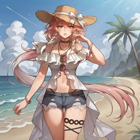 Chg_Alt, white shirt, frilled shirt, off-shoulder shirt, long skirt, white skirt, open skirt, frilled skirt, navel cutout, denim shorts, thigh strap, panty straps, straw hat, white ribbon, choker, necklace, bracelet, shoulder straps, bare shoulders, white sleeves, frilled sleeves, short sleeves,