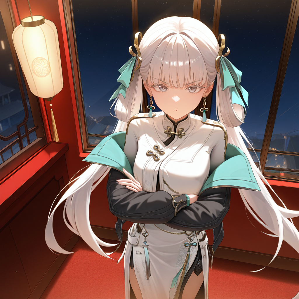 JinhsiWuwa, Fol003, Jhs_CN, 白发,发圈,双马尾,灰眼,旗袍,白色长裙,长裙,无肩带,白色领子,分离式领子,颈铃,替代金色镶边,金色发饰,侧开衩,羽毛围巾,分离式袖子,宽袖,白色袖子,袖长过肘,手镯,红色耳环,腕带,