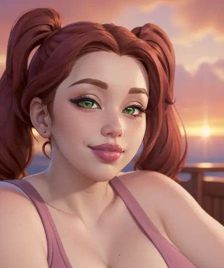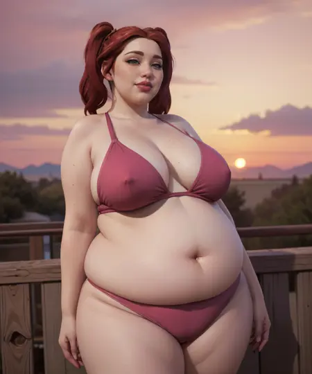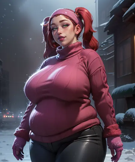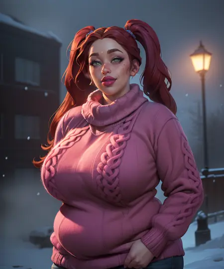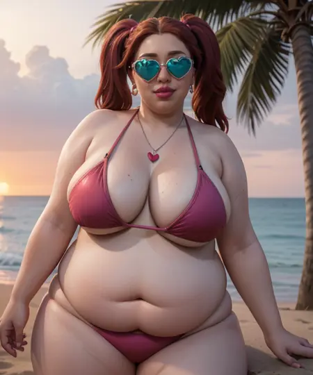 外观提示辅助词:green_eyes, red_twintails, makeup, freckles, huge_lips, plump, obese, fat, thick_thighs, deep_skin