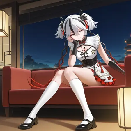 CamellyaWuwa, Fol003, Cml_CN, 白髪, 灰色の目, ツインテール, ストライプ髪, 黒ストライプ, 中国風衣装, 黒いコルセット, レイヤードドレス, 中国結び, 交差リボンコルセット, リボン付きシャツ, 深赤のトリム, 赤いリボン, 髪のリボン, 黒い花, 髪の花, 黒いアームウォーマー, 黒い房, 片方のハイソックス, 白いハイソックス, 黒い襟, 不均等な脚着物, 片方のニーハイ, 白いニーハイ, 二色スカート, 赤いボウ, 白いスカート, 赤いスカート, 花柄, 胸元の切り抜き, 捻じれた髪,