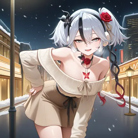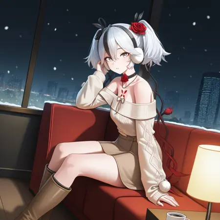 CamellyaWuwa, Fol001, Cml_Wnt, 白髪, 灰色の目, ツインテール, ストライプ髪, 黒ストライプ, 捻じれた髪, 薄茶色のセーター, オフショルダーセーター, 薄茶色の袖, ネックレス, 黒いヘアバンド, 長袖, 薄茶色のスカート, ポンポン(服), 肩を露出, 花のチョーカー, 黒いチョーカー, 赤いバラ, 黒い花, 髪の花, 耳あて, 薄茶色のリボン, ボウリボン, 薄茶色のブーツ, 膝上ブーツ,