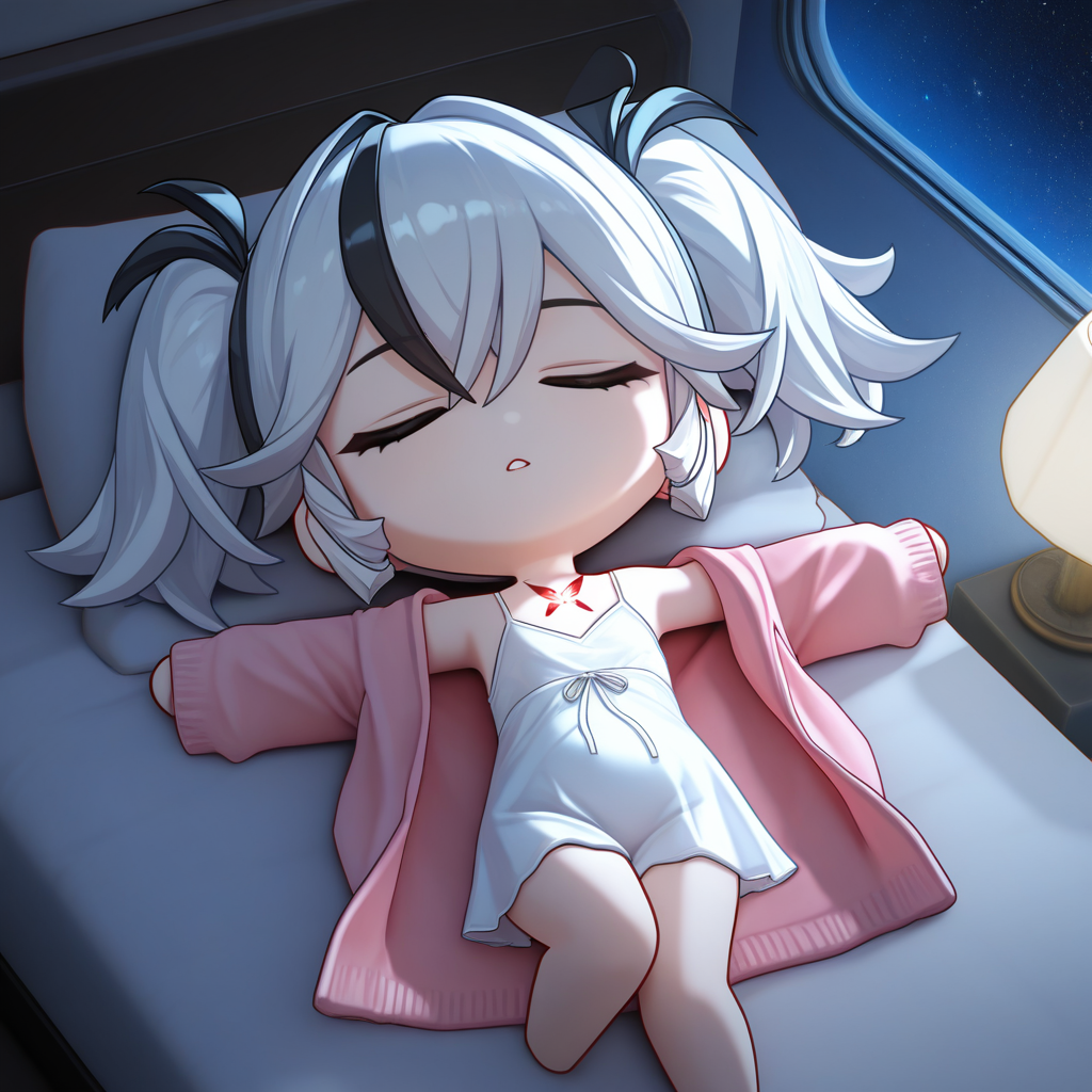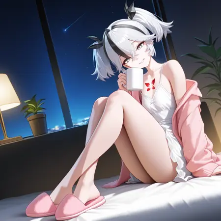 CamellyaWuwa, Fol002, Cml_Paj, 白髪, 灰色の目, ツインテール, ストライプ髪, 黒ストライプ, 捻じれた髪, 開いたカーディガン, 片方の肩出し, カミソール, 白いナイトガウン, スパゲッティストラップ, 花柄, フリル, ピンクのパジャマ, カーディガン, ピンクのカーディガン, 胸のタトゥー, 短髪,