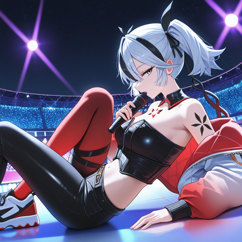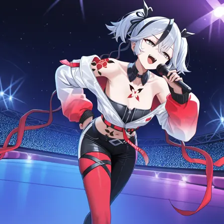 CamellyaWuwa, Fol003, Cml_Idl, 白髪, 灰色の目, ツインテール, ストライプ髪, 胸のタトゥー, ファスナー, オフショルダージャケット, 黒ストライプ, 部分的に開いたファスナー, ファスナートップ, バストアーチ, クロップドジャケット, 透けジャケット, レザーパンツ, 白いジャケット, 閉じたジャケット, 腹, おへそ, チューブトップ, 黒いチューブトップ, 肩のタトゥー, 赤いストール, アンダーバスト, 黒いタトゥー, お腹のタトゥー, オルタナティブ花のタトゥー, パフロングスリーブ, グラデーションスリーブ, 白い袖, 赤い袖, 黒い袖口, 黒いベルト, ベルトバックル, 片方のズボン足, 黒いズボン, 赤いパンティーストッキング, クロスストラップ, 太ももストラップ, 色違いの脚着物, 不一致な脚着物, 黒いリボン, 髪のリボン, 黒い外れ襟,