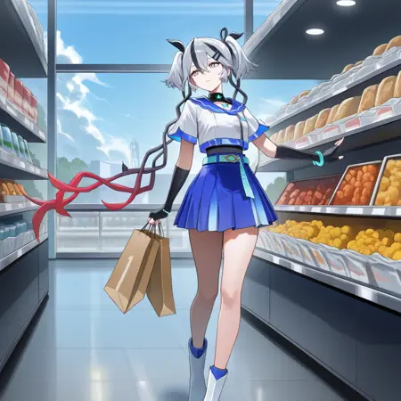 CamellyaWuwa, Fol002, Cml_Shp, 白髪, 灰色の目, ツインテール, ストライプ髪, 黒ストライプ, 捻じれた髪, 青いボウ, 髪のボウ, ヘアクリップ, ヘアピン, シャツをイン, 青いセーラーカラー, クロップドシャツ, 青いアンダーシャツ, シャツの下にシャツ, プリーツスカート, 青いスカート, 短袖, 白い袖, 白いアンクルブーツ, 青いベルト, 青いトリム, アクアベルト, 肘ガード, 黒い手袋, ビーズブレスレット, フィンガーレスグローブ, アクア蝶, 衣装の切り抜き, 黒いリボン, 髪のリボン,