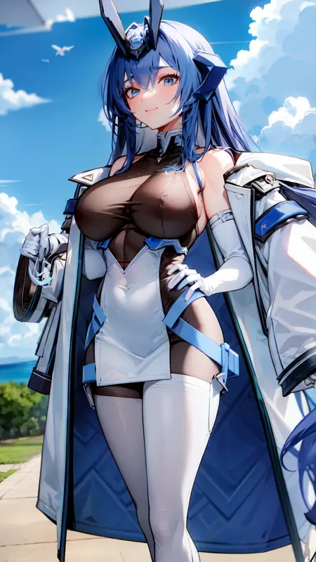 1girl, breasts, long hair, large breasts, solo, gloves, very long hair, bodystocking, full body, white gloves, blue hair, coat, headgear, dress, coat on shoulders, pantyhose, high heels, white dress, bangs, standing, blue eyes, smile, white coat, elbow gloves, covered navel, open coat, hair between eyes,lora:NewJerseyVRerun:0.8, ussnewjersey, blue sky, sky background, clouds, water, standing on water,