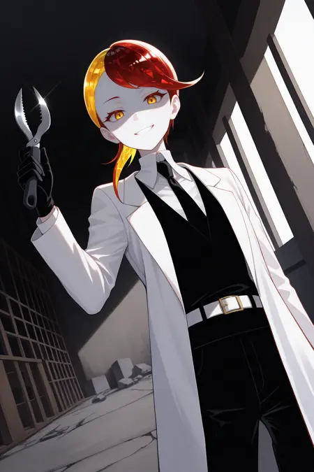 복장: 흰 실험복, 검은 셔츠, 흰 칼라 셔츠, 검은 넥타이, 흰 벨트, 검은 바지, 검은 신발, 검은 장갑