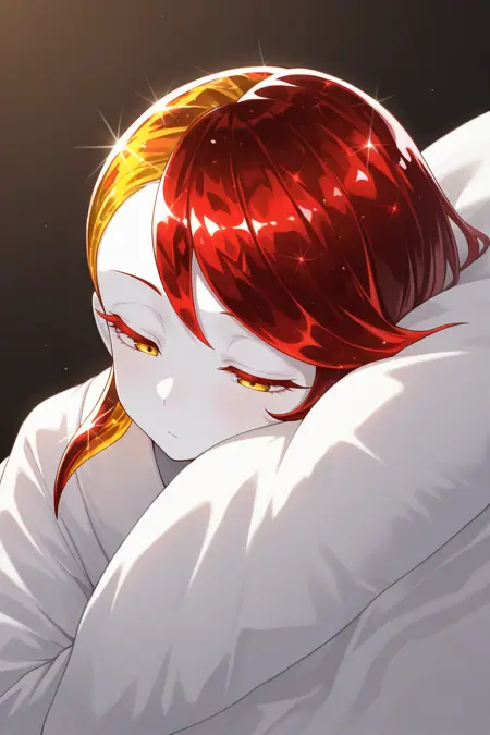외모: 1other, rut1le, 흰 피부, 크리스탈 머리카락, 색깔 있는 속눈썹, 다채로운 머리카락, 이색 머리카락, 노란 머리카락, 빨간 머리카락, 단발, 노란 눈