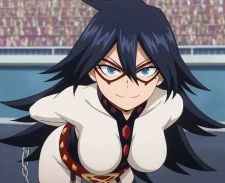 midng1, 1girl, blue eyes, large breasts, black hair, long hair, thighhighs, belt, mole under eye, domino mask, garter straps, hair between eyes, ringed eyes, bodysuit,