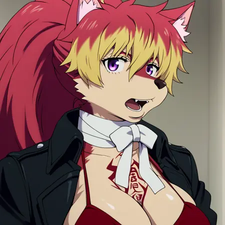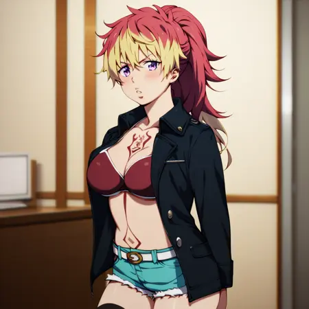 내가 프롬프트로 사용한 예시: shura kirigakure, kazue kato 아트스타일, 큰 입술, 보라색 눈, 다색 머리카락, 금발, 붉은 머리카락, 큰 가슴, 문신, 젖가슴 노출, 검정 재킷, 흰 리본 목걸이, 빨간 비키니 상의, 짧은 반바지, 벨트