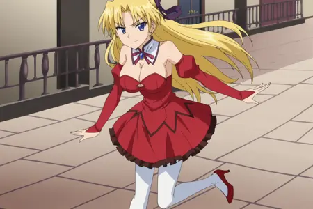 에리카 빨간 드레스 복장 | 빨간 드레스, 가슴 노출, 머리 리본, 분리된 소매, 보석, 장갑, 하이힐, 흰색 팬티스타킹 | 측면 가슴 노출
