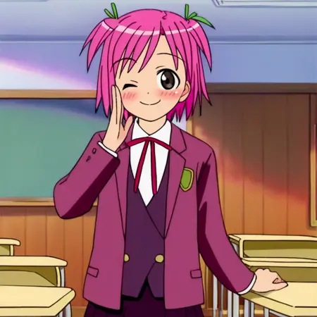 sasaki_m, 1girl, pink hair, short hair, hair ribbon, school uniform, jacket, skirt