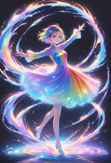 このLoRAは、虹のようなドレスを作成するために設計されています。魔法少女の変身シーンに役立つ可能性があると考えています。また、不思議な虹の輪も生成できます。